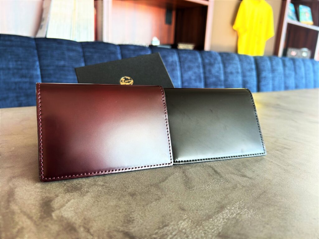 ちなみに素材は「コードバン(馬革)」で、国内有数の皮なめし企業・飯田市の「宮内産業」さんに製作をお願いしております。