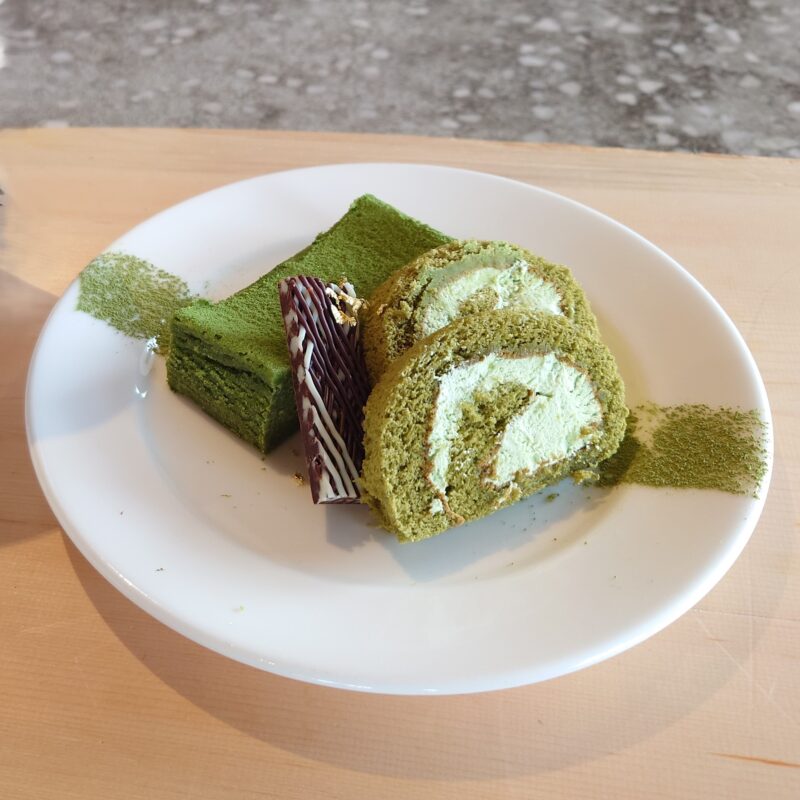 ふんわり甘いロールケーキと、宇治抹茶のほろ苦いテリーヌを合わせたケーキセット。金箔を添え、上品で特別感のある味わいを贅沢に楽しめます。