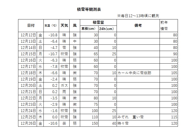この1週間で観測地点の積雪量は2倍以上になっております。また日々の温度変化も激しく一部で弱層化している可能性がございます。登山をされるお客様におかれましてはじゅうぶんな雪山装備のご準備の上で入山をお願い致します。軽装備での入山はお控えいただきますようくれぐれもご注意ください。