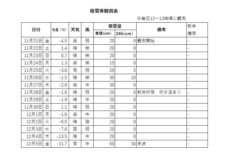 昨日からの寒波の影響で観測地点の積雪量が50cmまで増えました。遊歩道の場所も不明瞭になっておりますので散策は難しいかと思われます。また、気温もかなり低くなっておりますのでお越しの際は暖かい服装をご用意ください。登山をされるお客様におかれましてはじゅうぶんな雪山装備のご準備の上で入山をお願い致します。軽装備での入山はお控えいただきますようくれぐれもご注意ください。